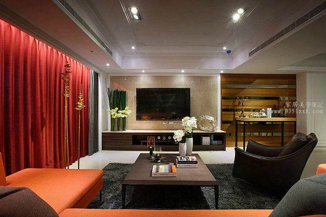 設計師採用大理石作為電視主牆,側邊立面則採以木皮及明鏡排列,構織出空間的層次。