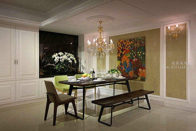 以對稱及簡化的古典線條為基底,並透過璀璨的水晶吊燈與壁燈,營造新古典的語彙。