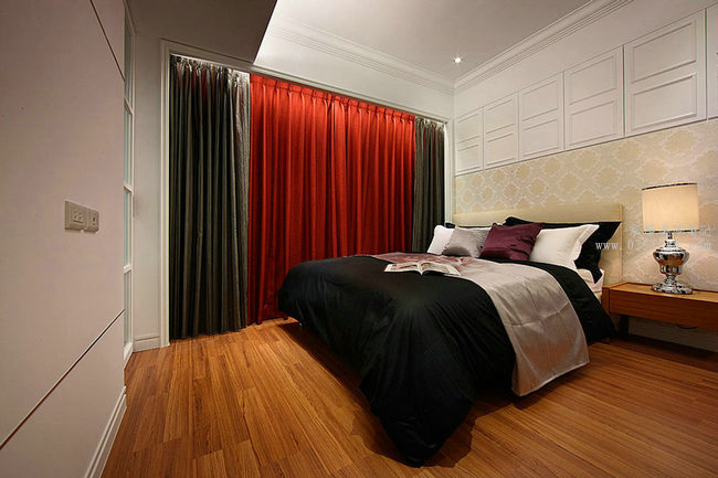 主臥床頭壁紙與線板,圍塑一貫的現代新古典氛圍,並利用10厘米的樑柱深度構置收納櫃,善用每處空間。