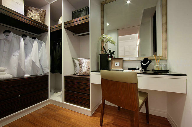 用沉穩色調的線板做為開放式的更衣空間,並整合梳妝台的功能,讓屋主使用上更便利。