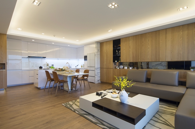 ▲開放式餐廚空間與客廳毗鄰,藉由一體性天花板串聯,有效延伸視覺感。