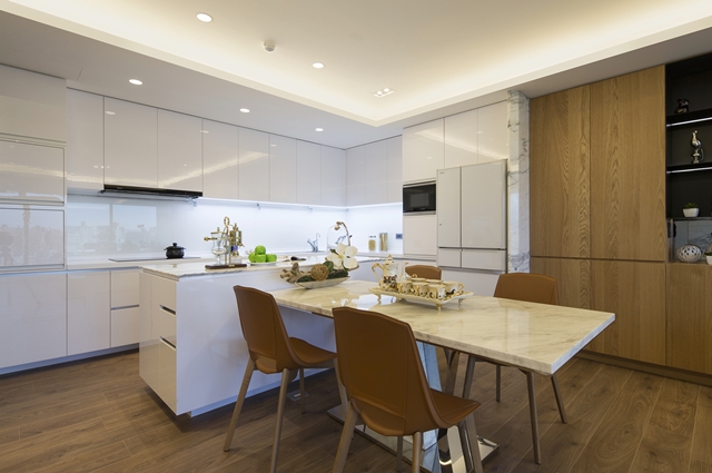 5.餐桌緊鄰廚房中島,傳遞料理十分便利,餐敘氛圍也洋溢輕鬆自在氣息;設計師以白色規劃廚房,搭配大理石檯面中島,潔淨閃亮人見人愛。