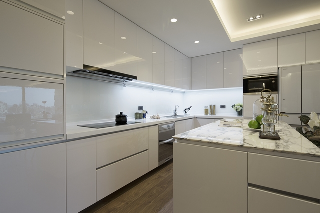 ▲康乾設計工程黃維晢設計師以白色規劃廚房,搭配大理石檯面中島,潔淨閃亮人見人愛。
