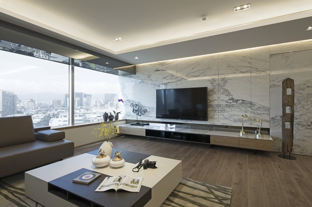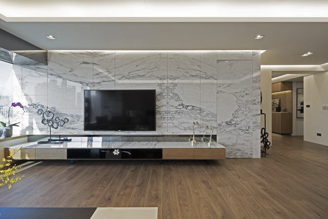 4.大理石電視牆搭配懸空檯面,展現俐落現代感,光滑立面右側暗藏牆後小房間入口。