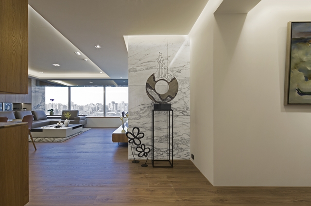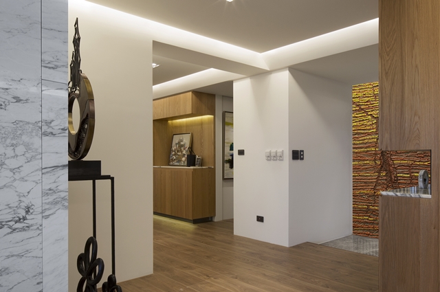 ▲公私領域轉換的過渡空間,打造精美展示櫃、掛畫、擺件、石材鋪面等,讓過道猶如藝廊景致。