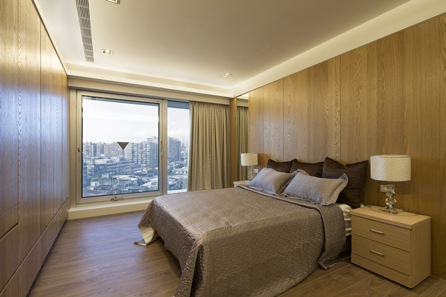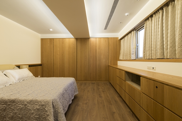 6.主臥以木質為主材,鋪陳主牆立面與衣櫃等機能設計,營造沉穩溫潤的臥眠情境。