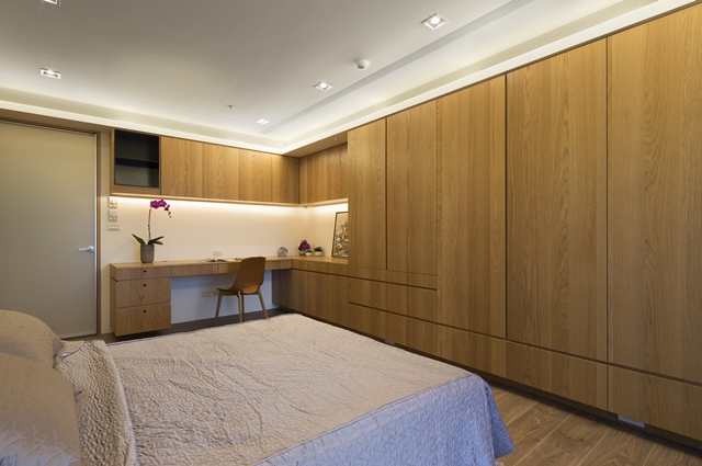 ▲維持天花板高度,以光源搭配橋式修飾板消弭樑位,木質立面除衣櫃之外,包含隱藏門進入利用畸零地改作的更衣室。